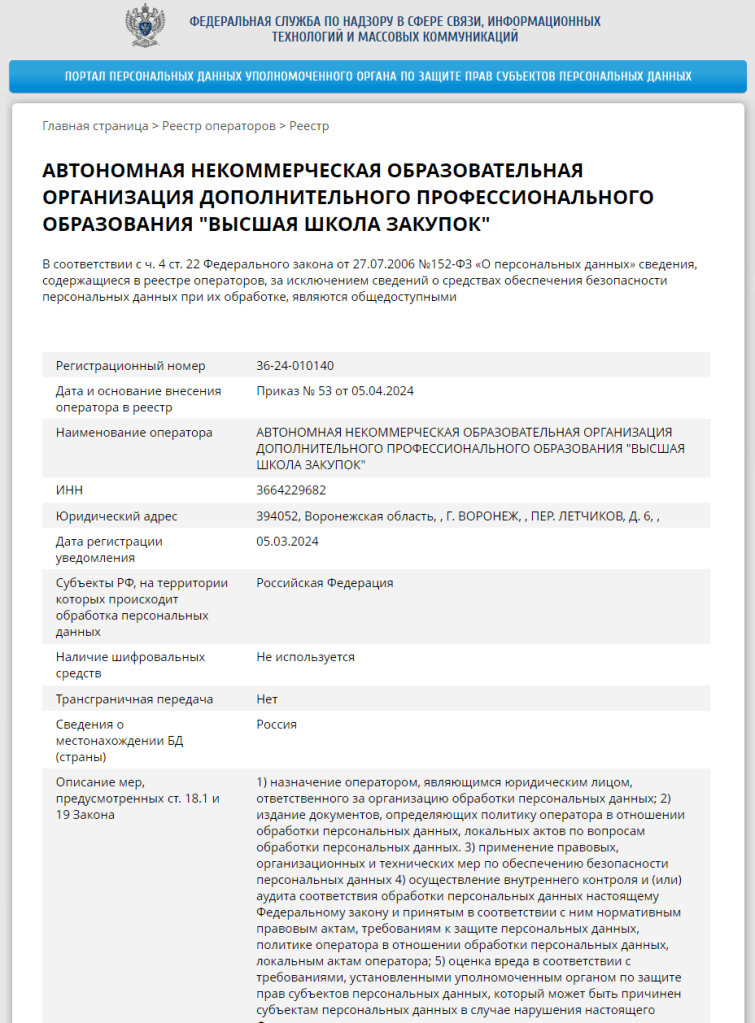 Учебный центр «Высшая школа закупок» зарегистрирован РОСКОМНАДЗОРОМ в качестве оператора, осуществляющего обработку персональных данных (номер в реестре операторов - 36-24-010140), обеспечивая надежную защиту персональных данных слушателей.